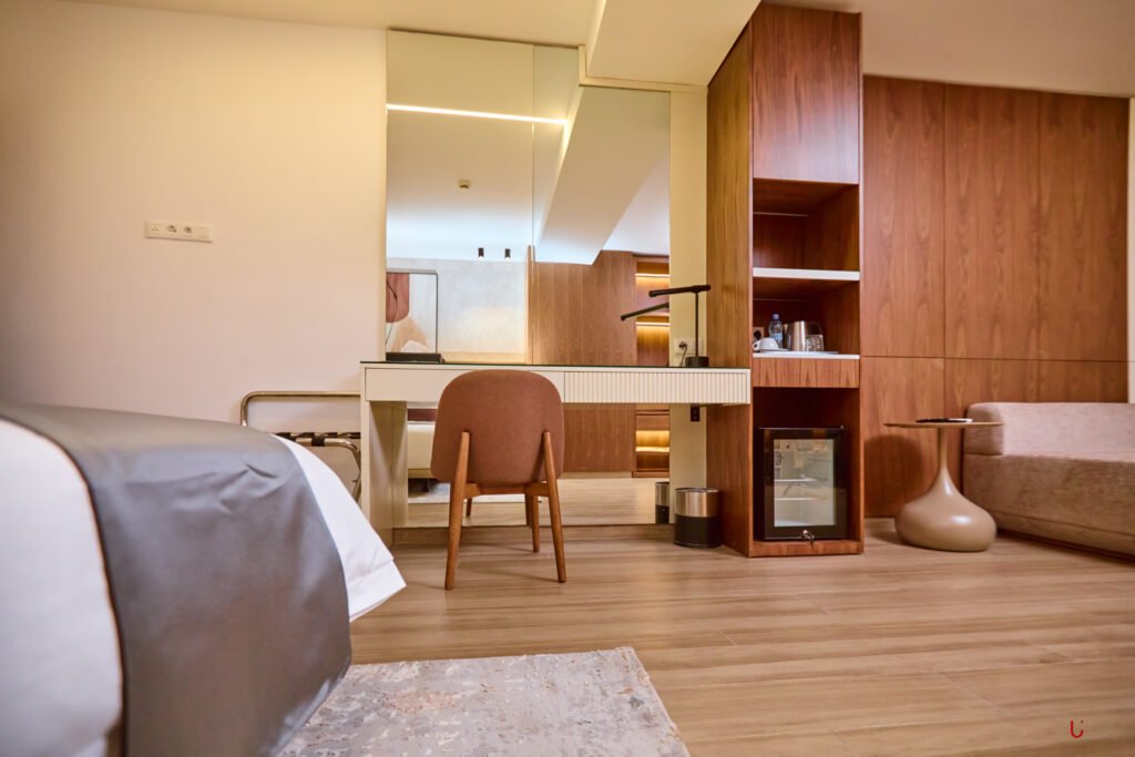 Offrant une superficie de 28 m², la Chambre Supérieure allie confort moderne et élégance contemporaine. Elle dispose d’un lit king size, d’un espace bureau fonctionnel, ainsi que d’une salle de bain privative entièrement équipée pour un séjour agréable.