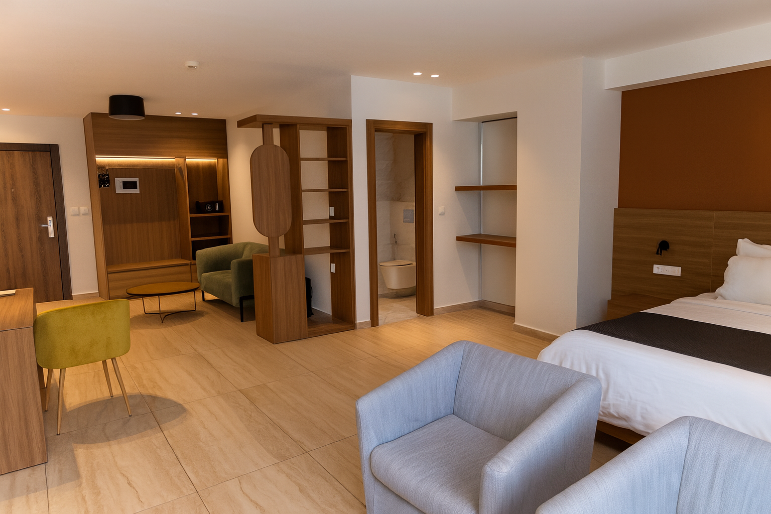 It has a bedroom area with king size bed, a separate living room, an office area and an elegant, perfectly equipped bathroom.